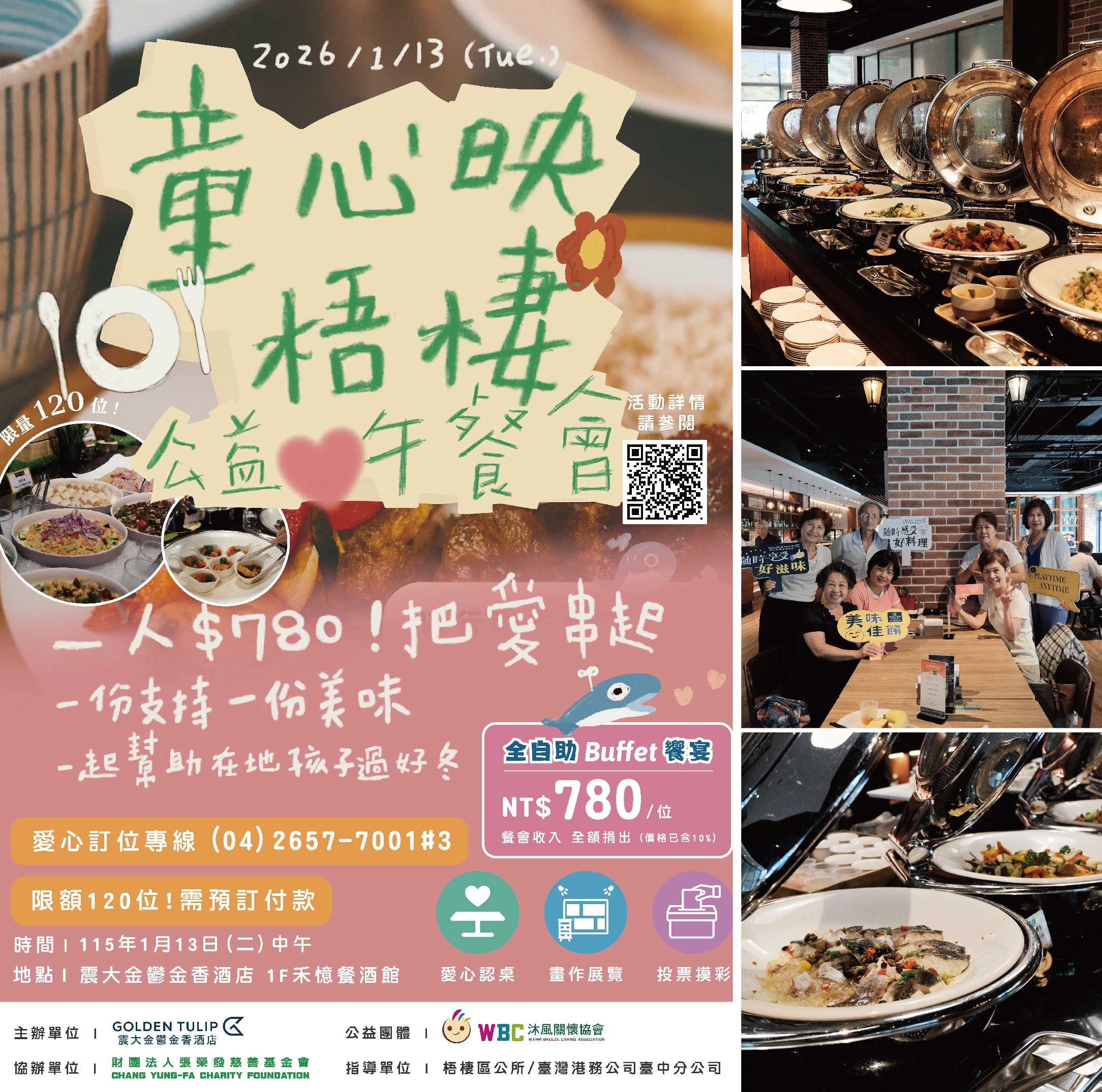 2026年1月13日中午,我們將舉辦一場公益午餐,全自助形式,所有午餐所得將全數捐贈給沐風關懷協會。讓我們一起支持這份愛與關懷,共同傳遞溫暖與希望
